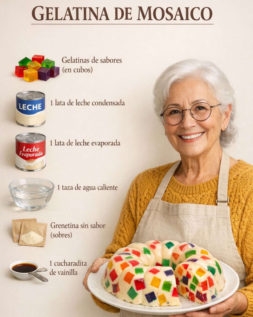 GELATINA DE MOSAICO Ingredientes:Gelatinas de sabores (en cubos)1 lata de leche condensada1 lata de leche evaporada1 taza de agua calienteGrenetina sin sabor (sobres)1 cucharadita de vainillaPreparación: